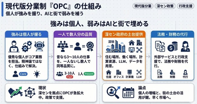 要するに、現代版の分業制です。昔なら3人、5人、10人で回していた仕事を、一人ないし数人で同等の品質まで持っていけるかです。そのために、住む場所、働く場所、計算資源、LLM利用、データ、法務や財務の代行まで用意して、市場に早く出ろと言っているわけです。深センのOPC政策を読むと、街の側が先に土台を作り、戦える個人を増幅させようとしていることがよくわかります。 今までルフィ海賊団として成り立っていた麦わらの一味がいきなり狙撃ができて、病気を治せて、船も修理でき、航海もでき、調理もでき、考古学に造詣が深いルフィが誕生って感じでしょうか(最近のワンピース読んでいないので間違ってたらすみません)。