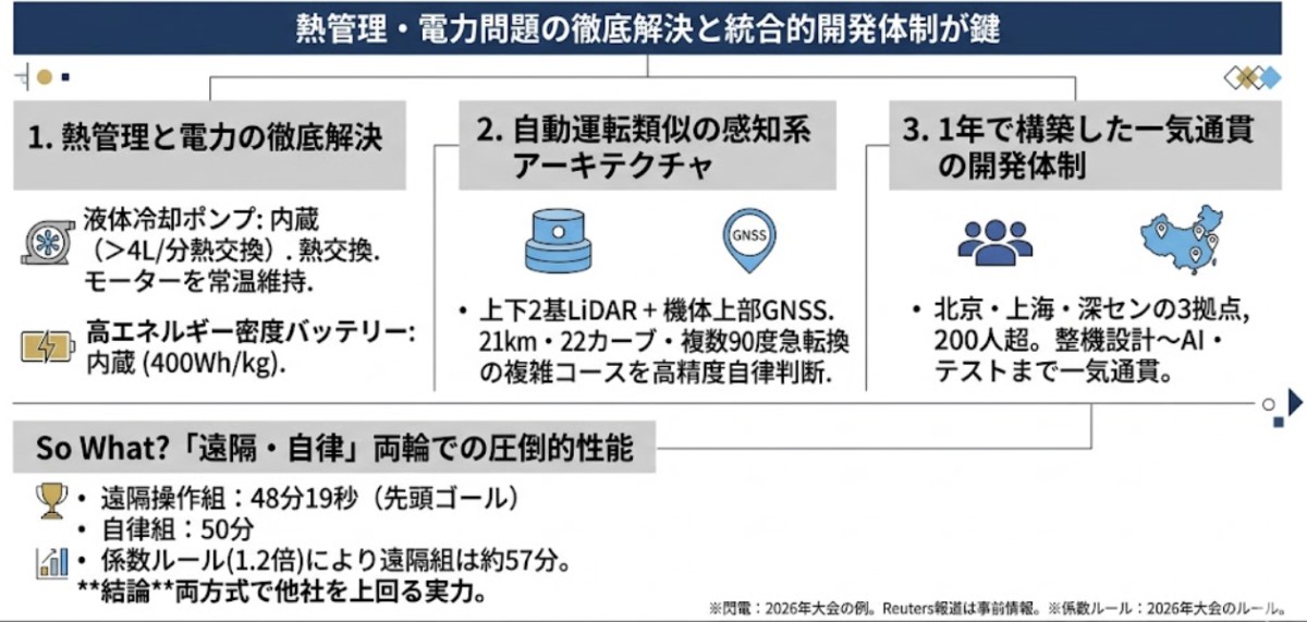 ひとつ付け加えておくと、今回の大会では「遠隔操作組の閃電」も最初にゴールラインを切っています。タイム48分19秒で先頭でゴールしたのですが、遠隔操作組には成績係数1.2倍のペナルティが課されるルール設計のため、換算後タイムは約57分となり自律組に及びませんでした。つまりHonorのロボットは遠隔操作でも自律走行でも他社を上回っていたわけで、この事実はもう少し注目されてよいと思います。