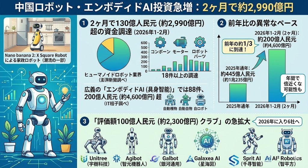 中国の大手メディア「澎湃新聞」の集計によると、2026年の最初の2ヶ月だけで、ヒューマノイドロボット業界(部品メーカー含む)に少なくとも18件、総額130億人民元(約2,990億円)以上の資金調達が行われました。