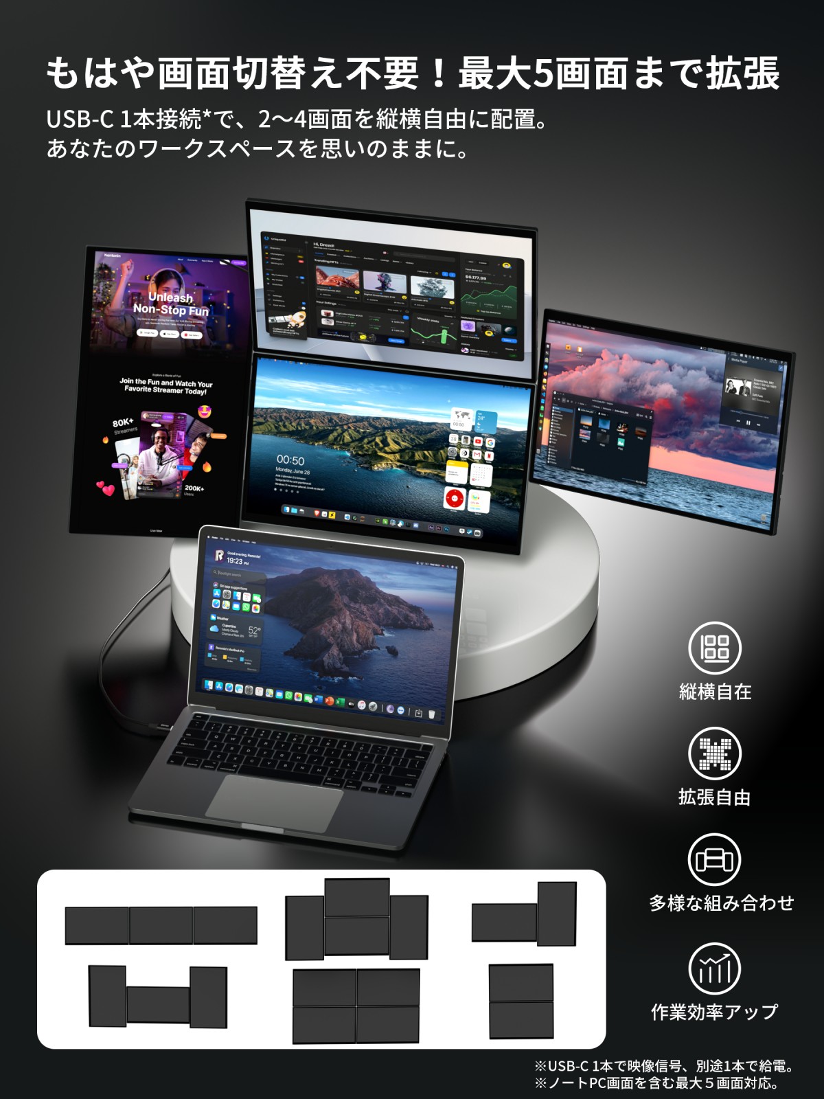 まず、PCのGPUに負荷を集中させない独自設計を採用したことで、ハイスペック機に依存せず安定したマルチモニター環境を構築できます。推奨3〜4面、最大5面の同時出力に対応し、資料・ブラウザ・生成AIツール・チャットなど、切り替えなしで並列処理が可能です。これは、複数アプリをまたぐ現代の知的生産において、思考を止めずに流れを維持するうえで大きなアドバンテージになります。