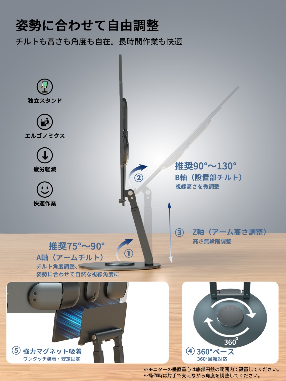 さらに、エルゴノミクス設計にもこだわりました。高さは約20〜31cmで調整可能、高角度チルトと360°回転に対応し、省スペースでの多面展開を実現します。限られたデスクトップでも、ワークフローに合わせて視認性と没入感を両立でき、まるで“指揮塔”のような環境が生まれます。