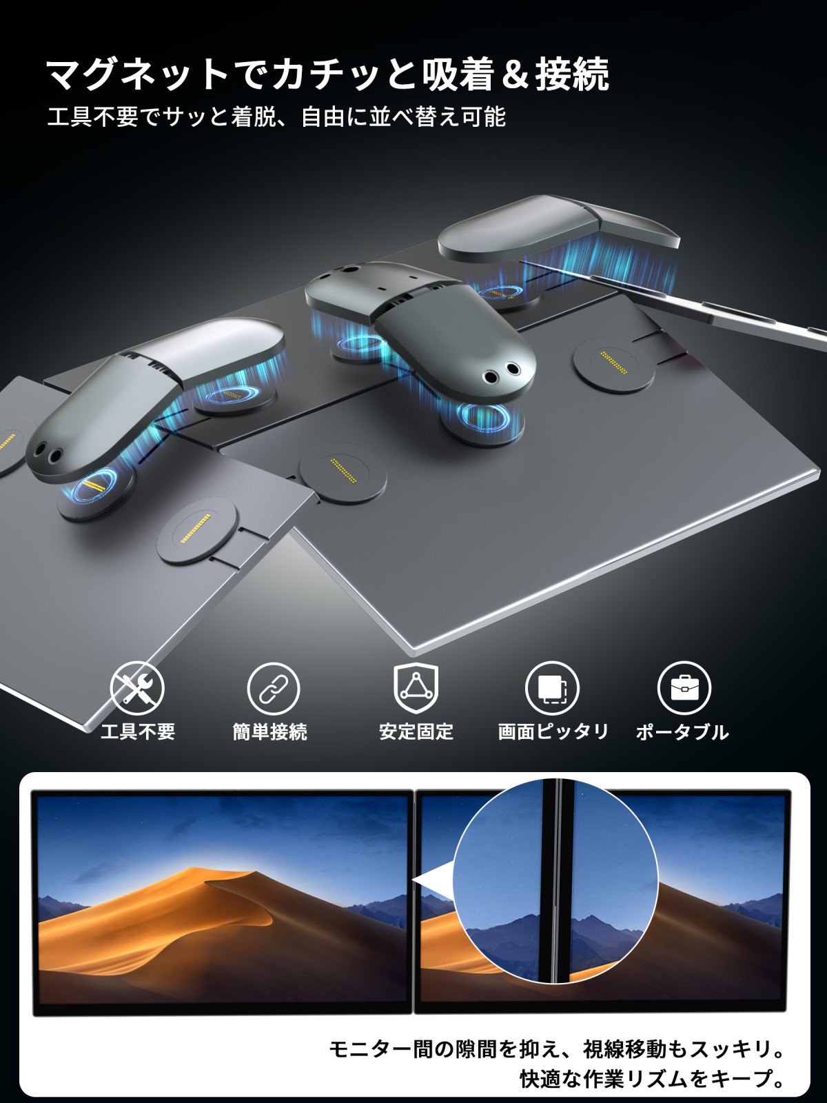 次に、マグネット接続による1秒着脱に対応しています。モニター同士を「パチッ」とつなぐだけで映像信号と給電が同時に確立され、縦横の切り替えやレイアウト変更も瞬時に行えます。作業内容に応じて“文章は縦、資料は横”といった柔軟な配置ができ、会議・出張・カフェワークでも素早く理想のセットアップを再現できます。